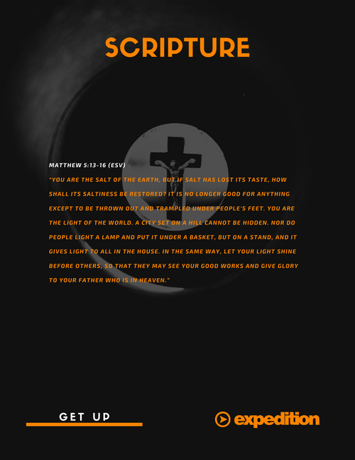 Matthew 5:13-16 (ESV) “You are the salt of the earth, but if salt has lost its taste, how shall its saltiness be restored? It is no longer good for anything except to be thrown out and trampled under people's feet. You are the light of the world. A city set on a hill cannot be hidden. Nor do people light a lamp and put it under a basket, but on a stand, and it gives light to all in the house. In the same way, let your light shine before others, so that they may see your good works and give glory to your Father who is in heaven.”